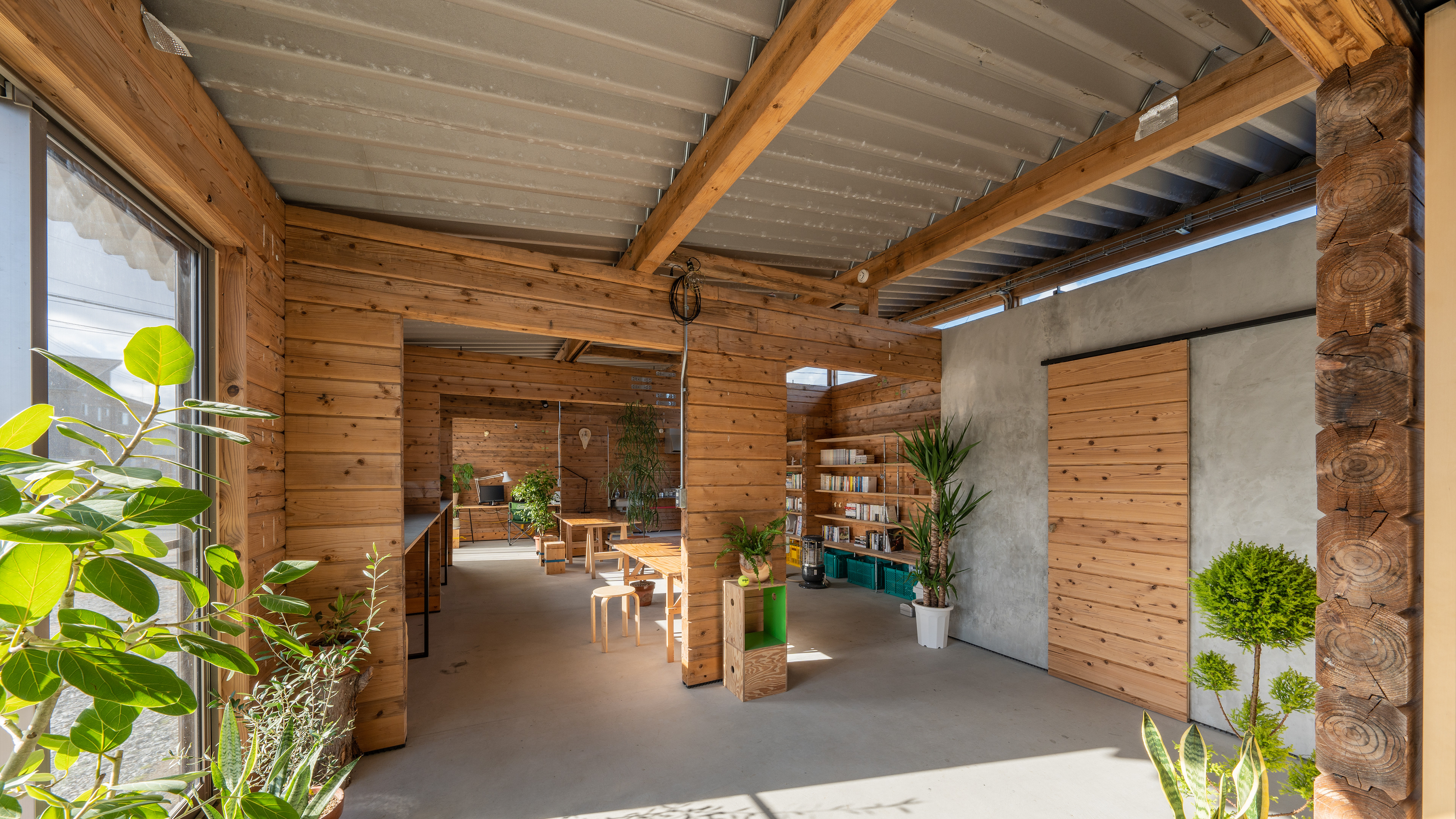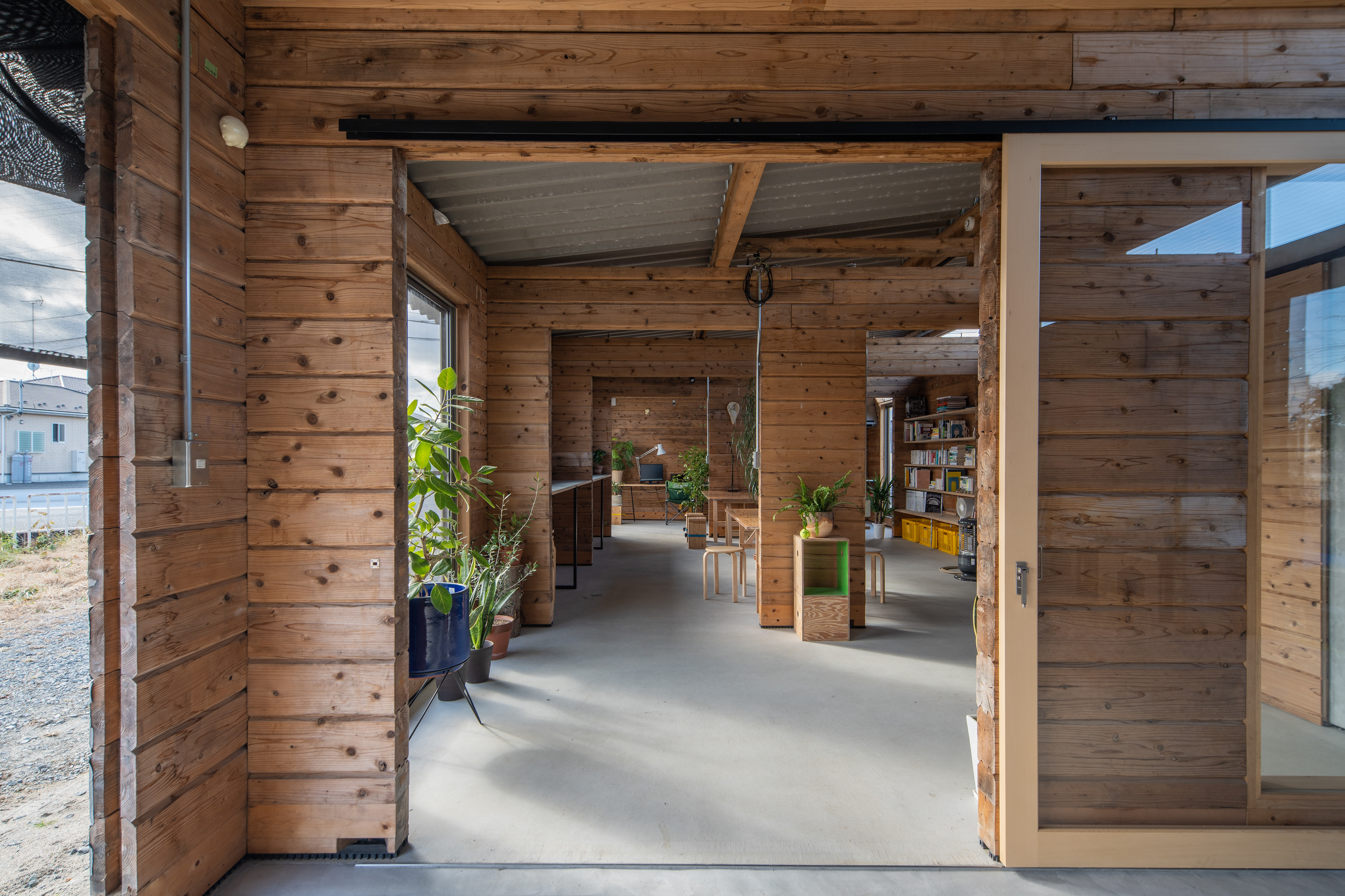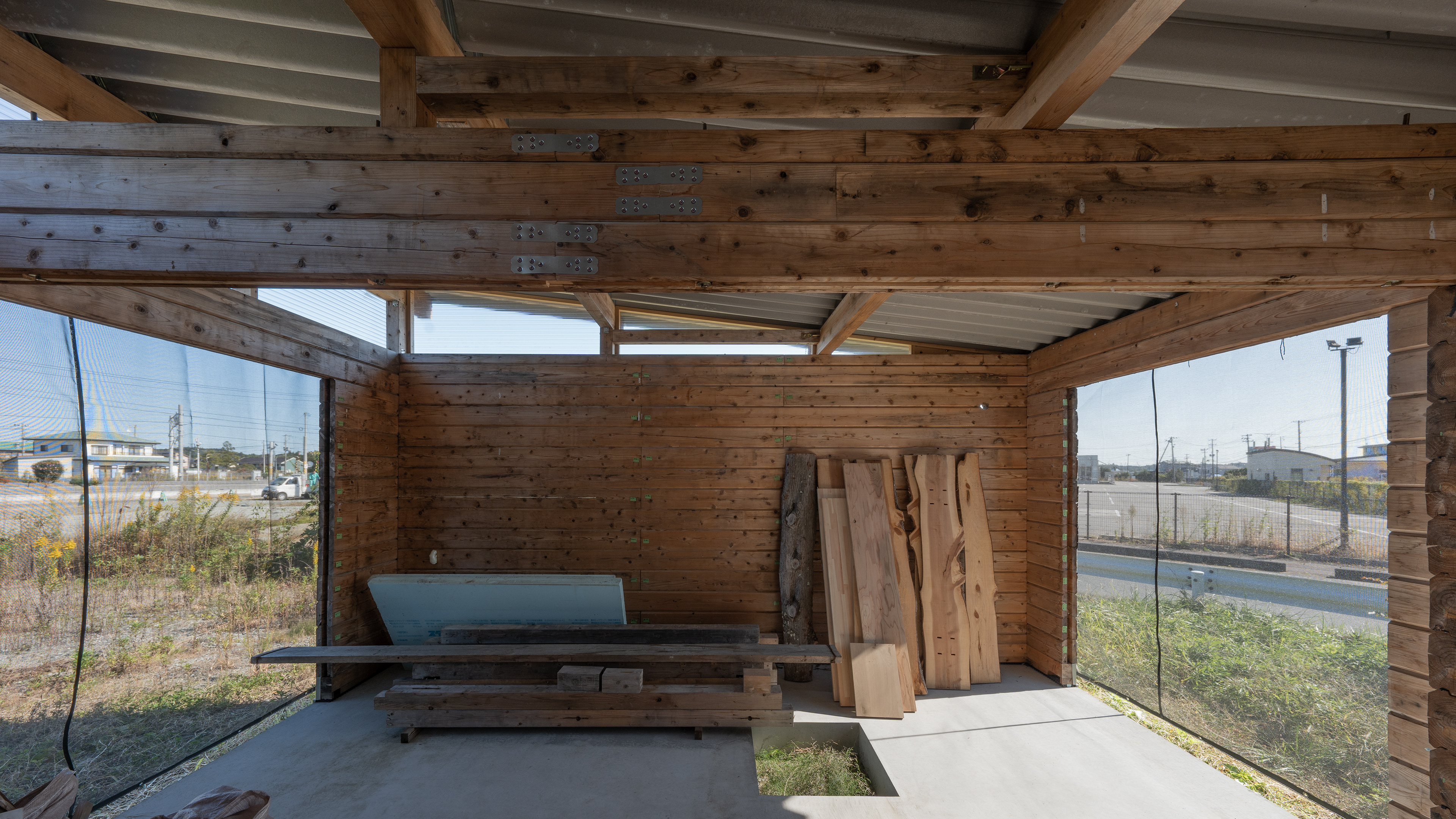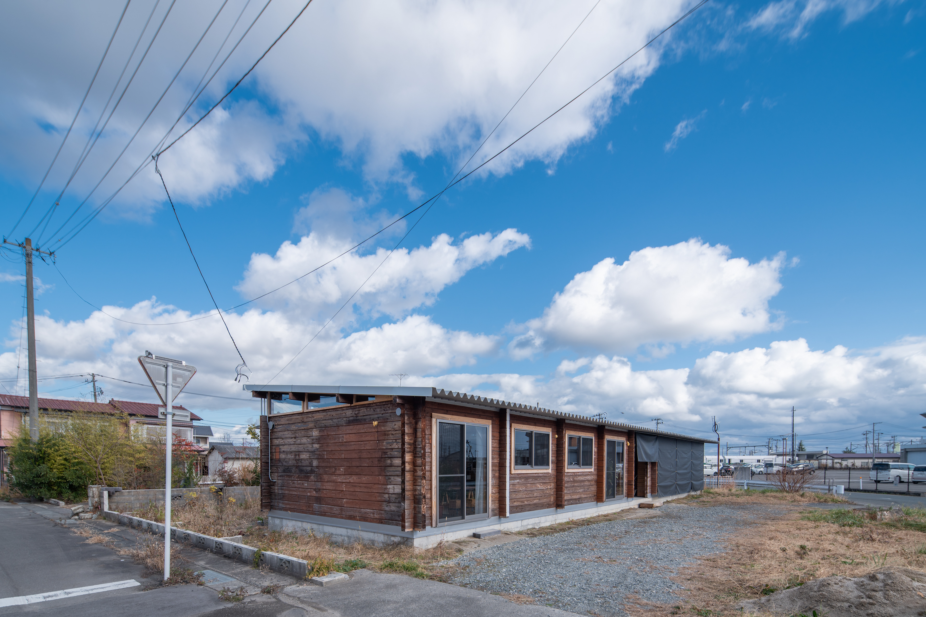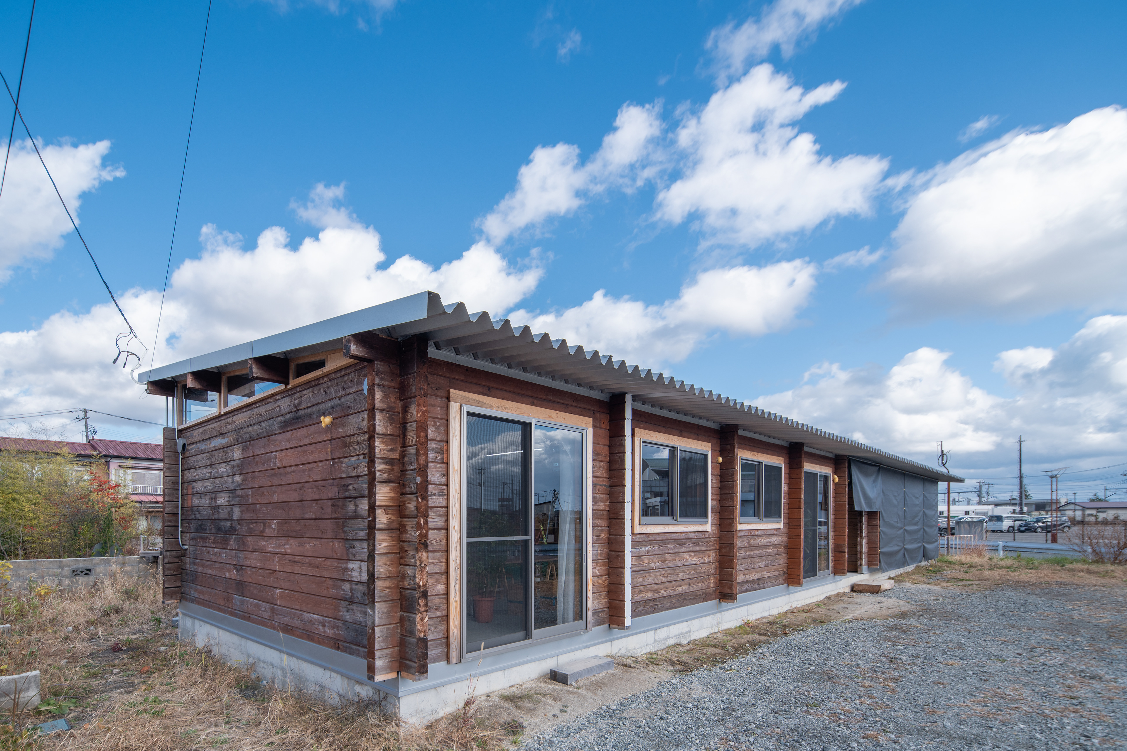 設計・施工:Fimstudio/用途:事務所/構造:W造(丸太組構法:ログ仮設再利用)/福島県浪江町/2022年