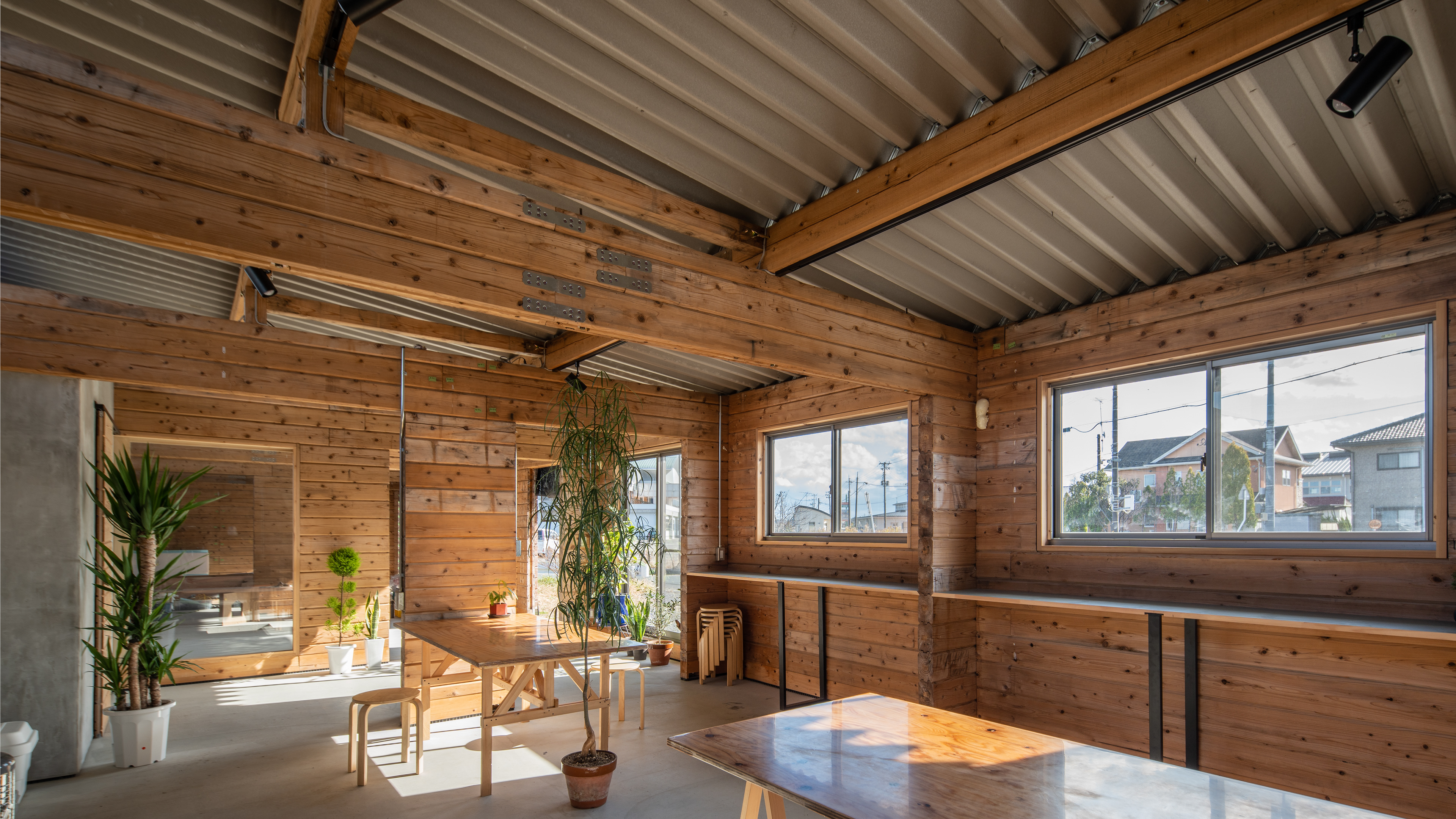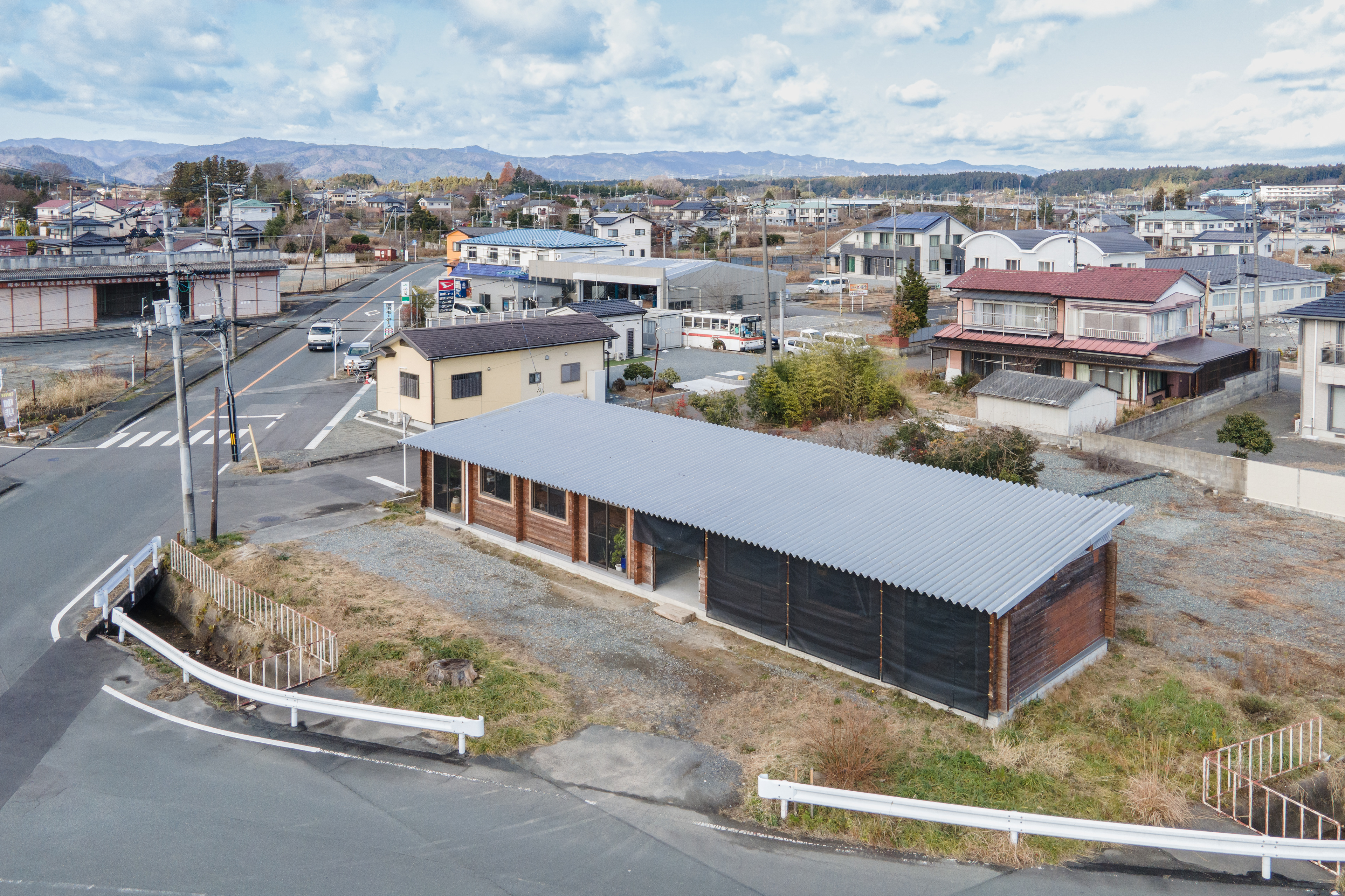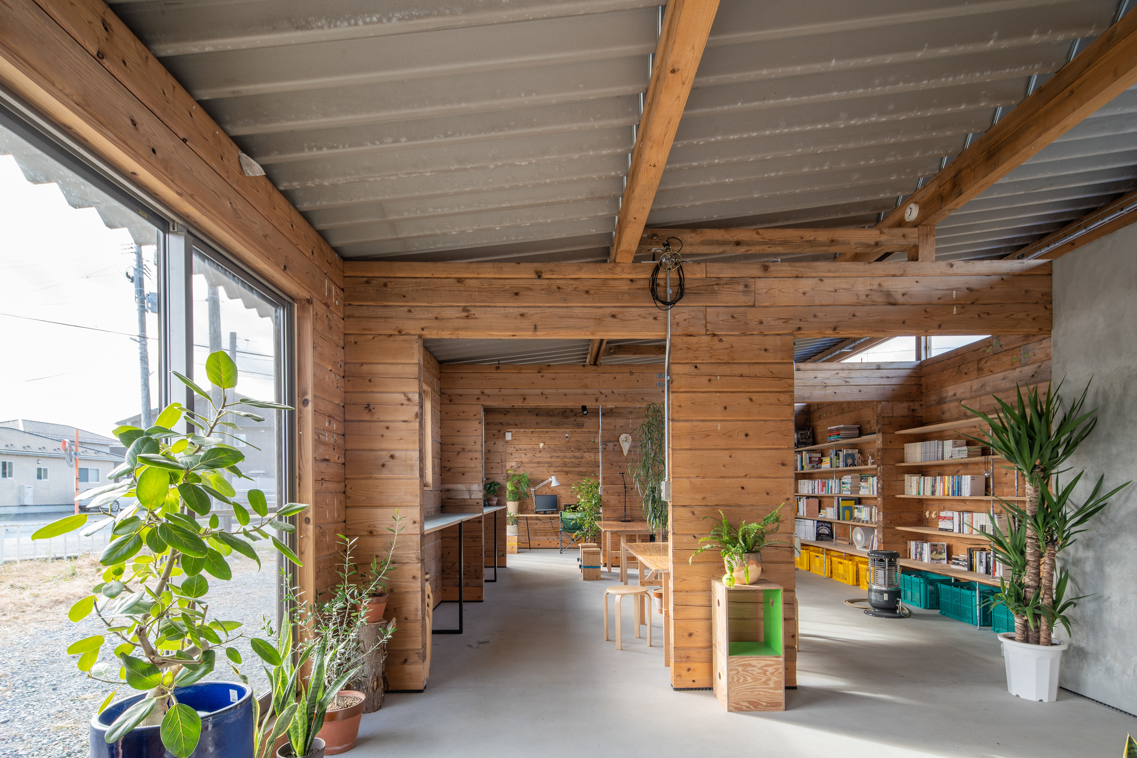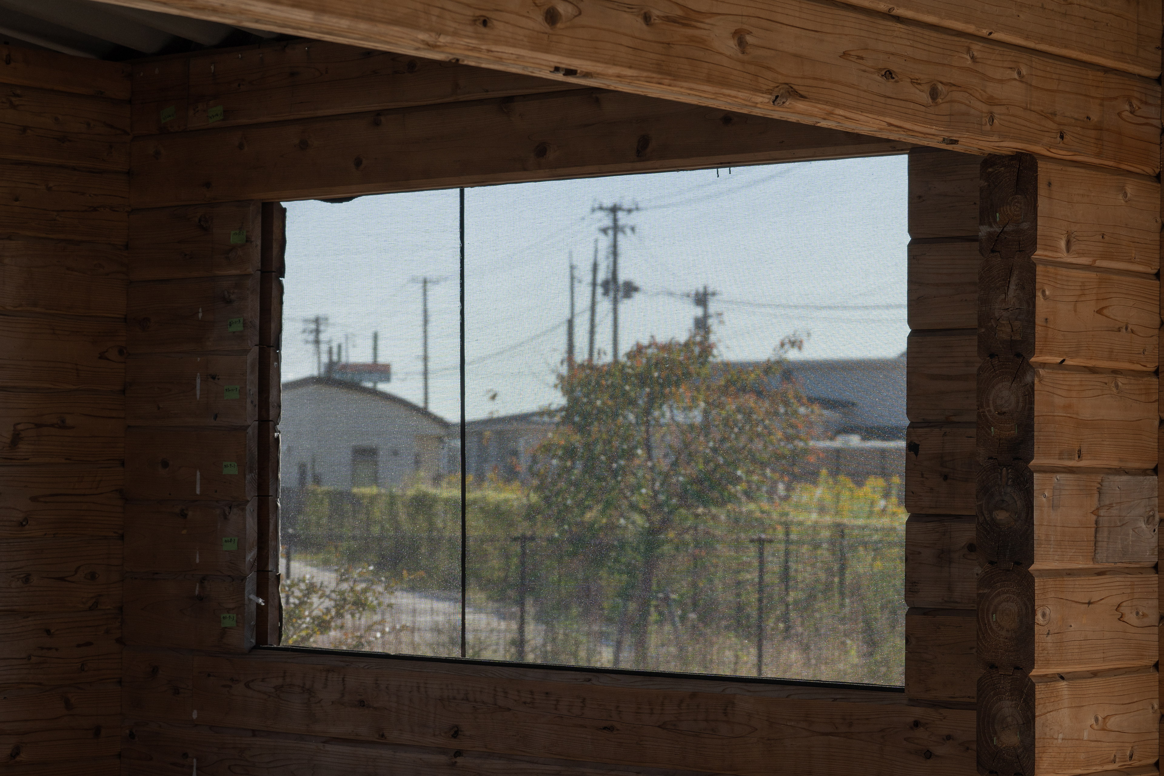 設計・施工:Fimstudio/用途:事務所/構造:W造(丸太組構法:ログ仮設再利用)/福島県浪江町/2022年