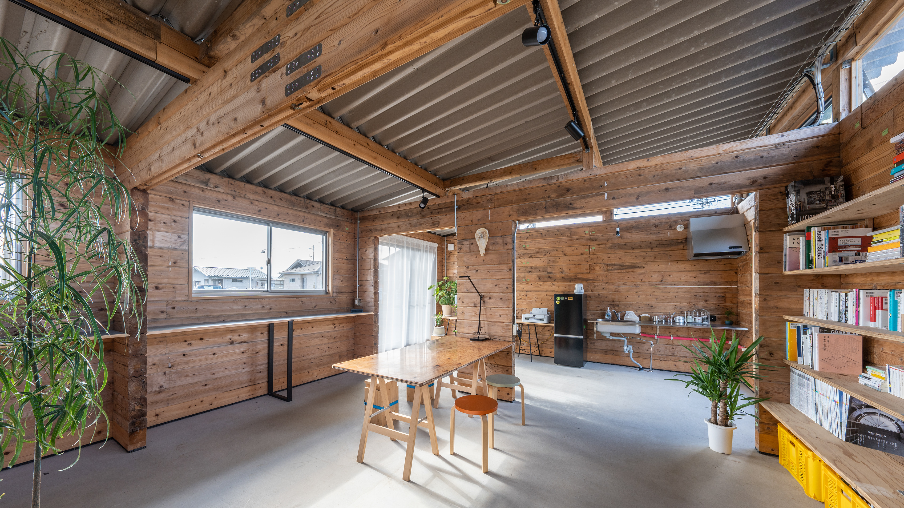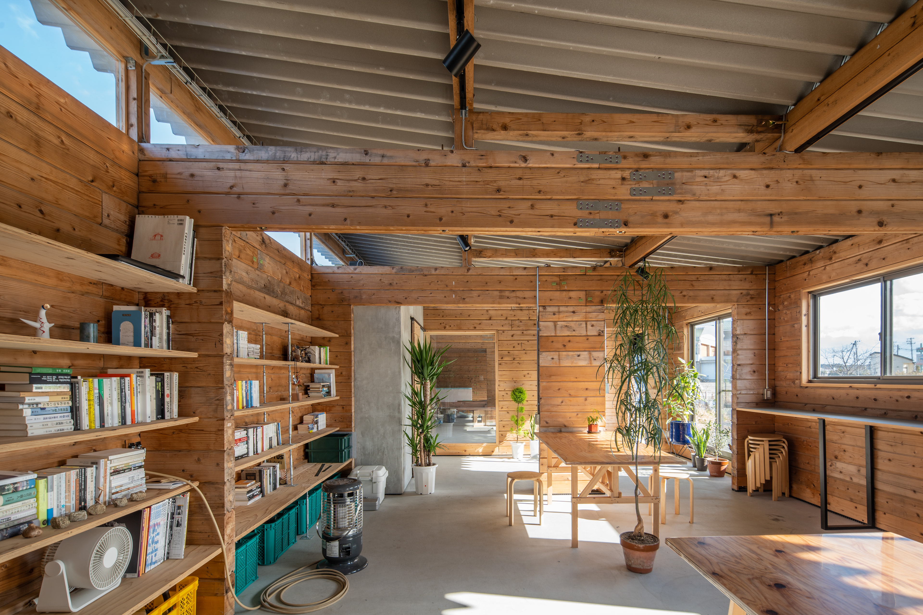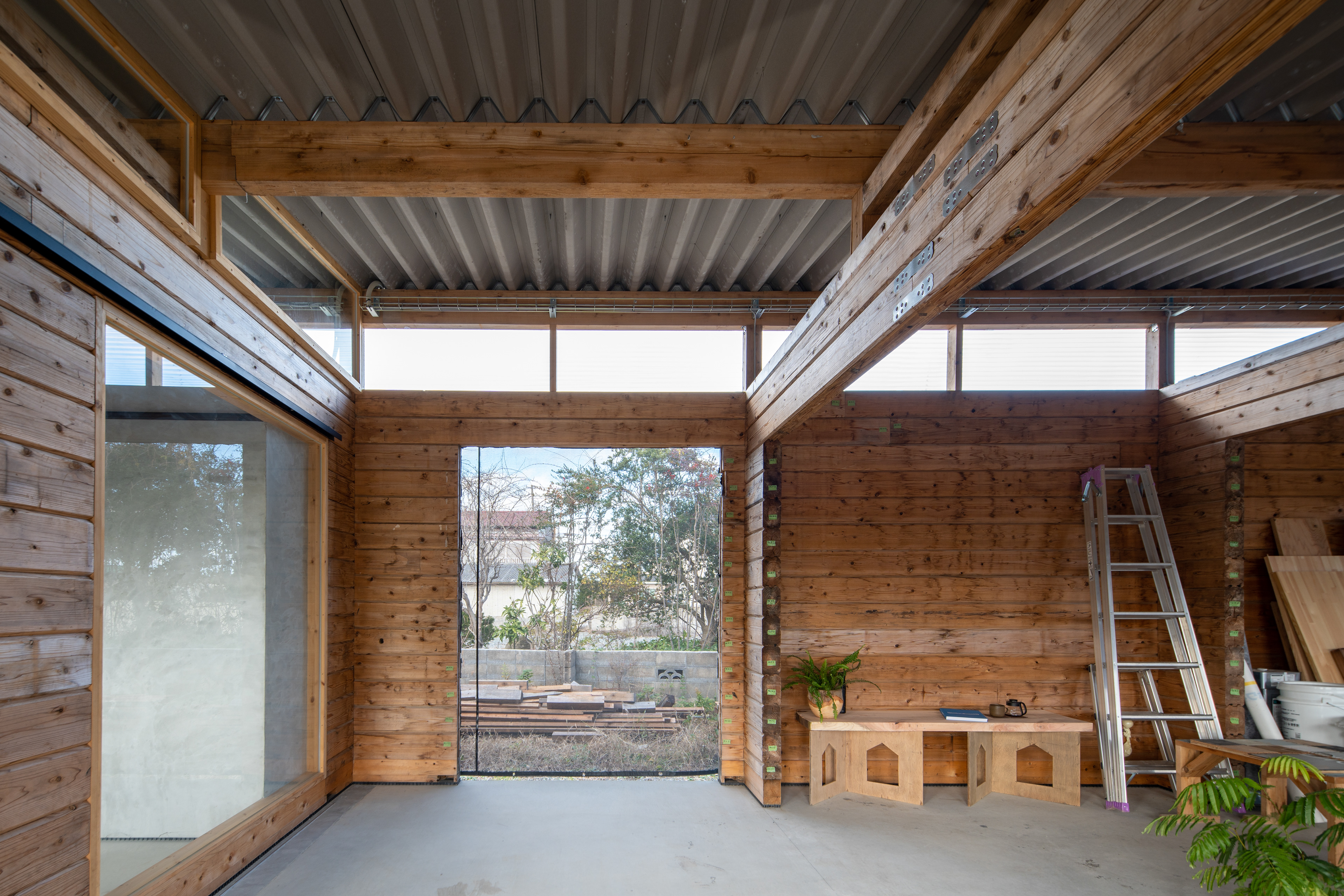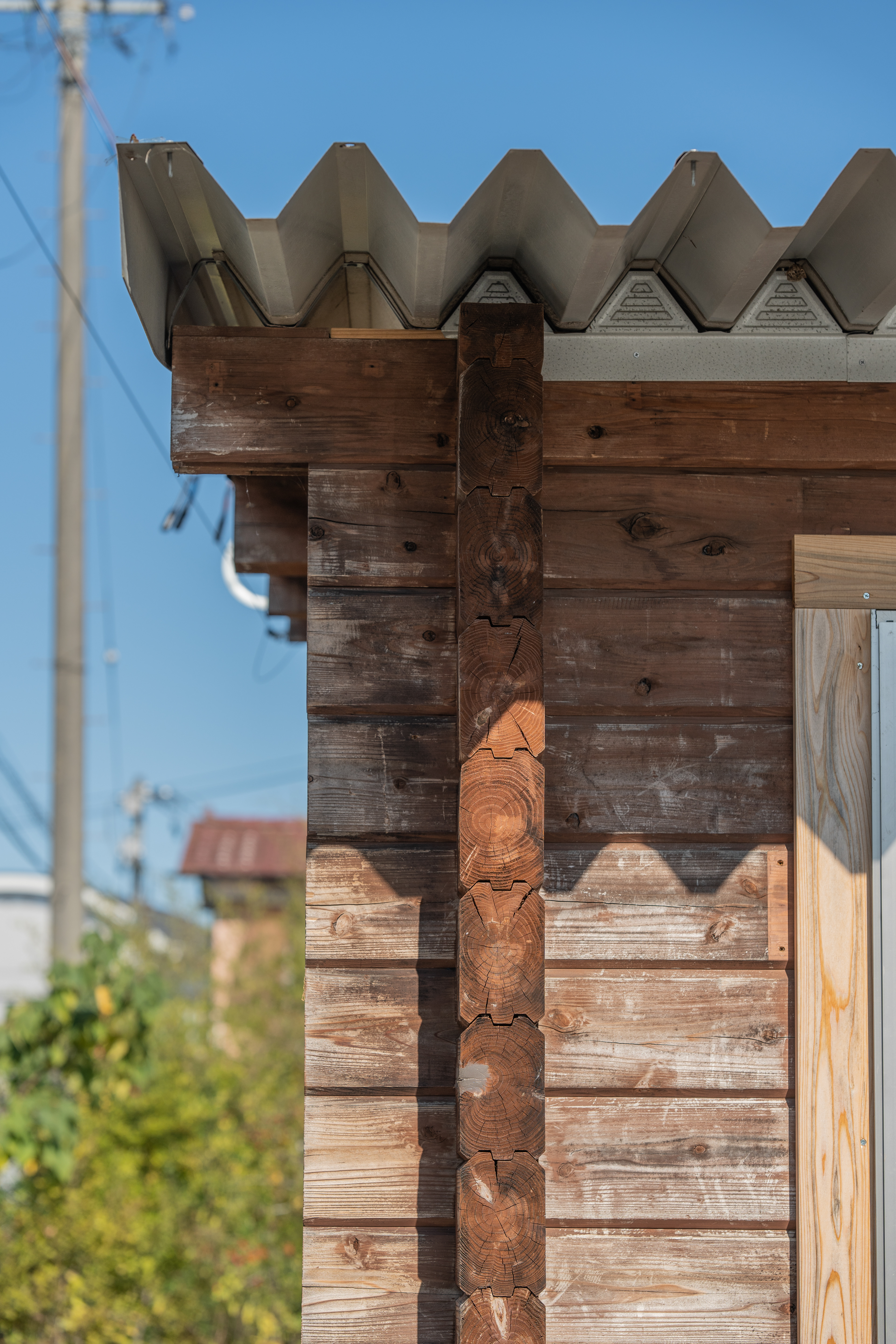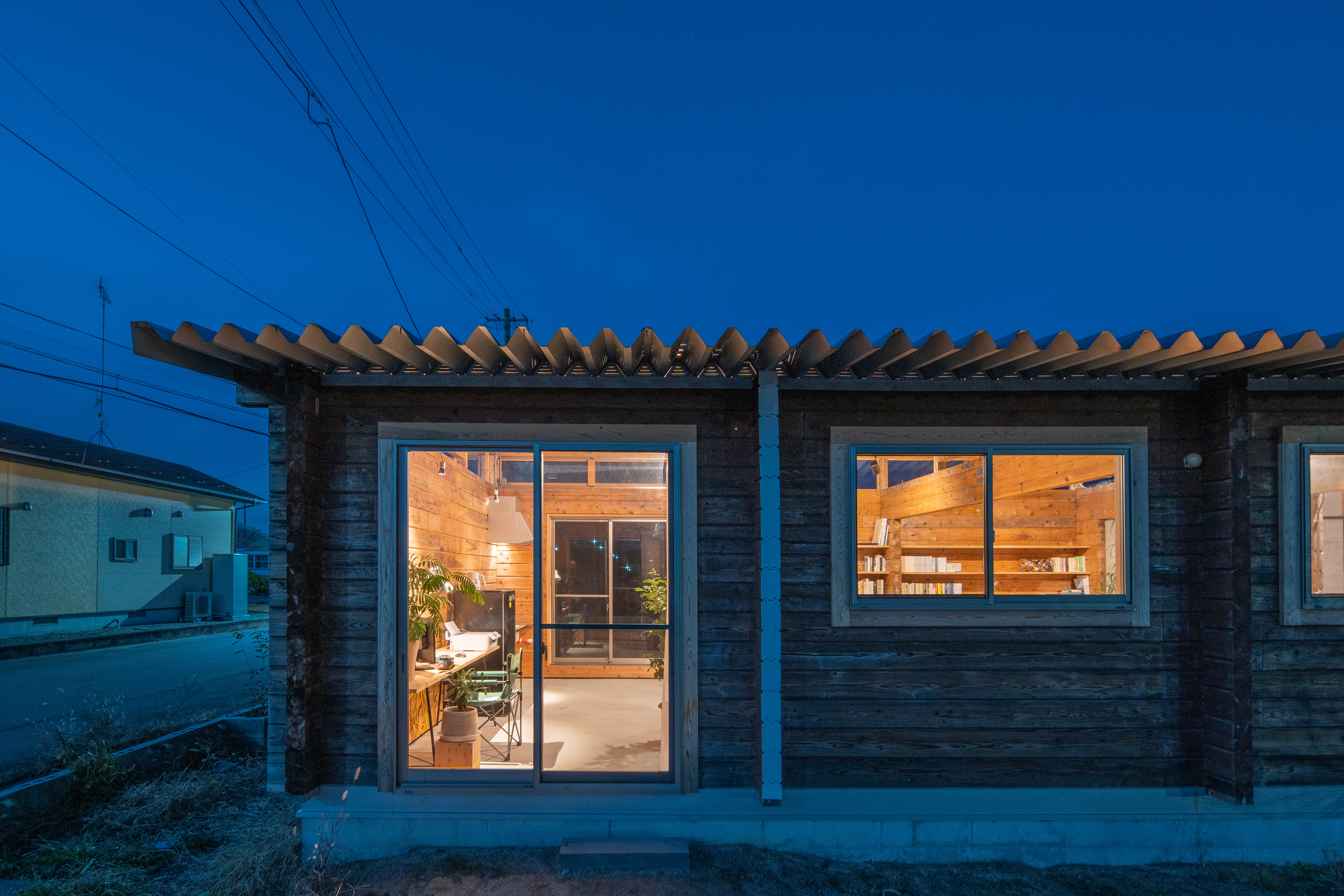 設計・施工:Fimstudio/用途:事務所/構造:W造(丸太組構法:ログ仮設再利用)/福島県浪江町/2022年